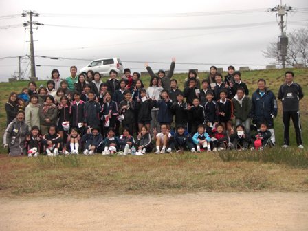 6年生、走り終わった後、応援に来て下さった保護者の皆さんと一緒に記念写真、みんないい笑顔ですね。