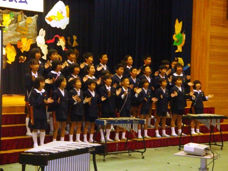 5年生。斉唱「歩いていこう」 二部合唱「銀河を見た」 リコーダー奏「星に願いを」「ホール・ニュー・ワールド」