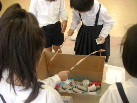 さかなつりコーナー、磁石を使ってうまくつり上げます。重さによって点数が違います。