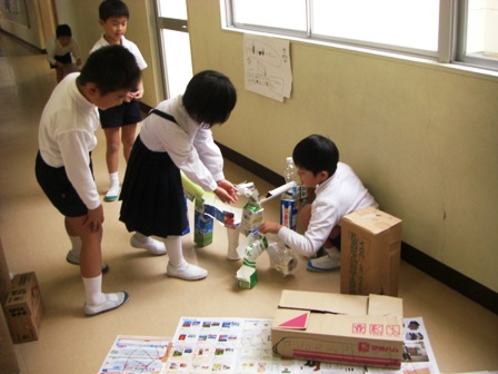 ピタコラコーナー、いろんな入れ物を組み合わせて作ったジェットコースターにビー玉を転がせます。