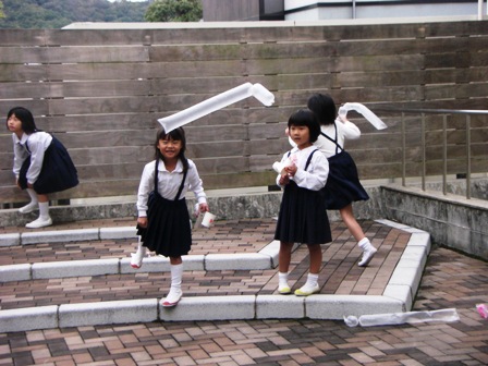 ロケットふくろコーナー、細長いビニルふくろに空気をいっぱい入れて飛ばします、フワッと投げるといいみたいです。