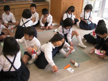 それぞれのコーナーでたくさんの景品やおみやげをもらい、自慢しあう1年生。楽しそうでしたね。