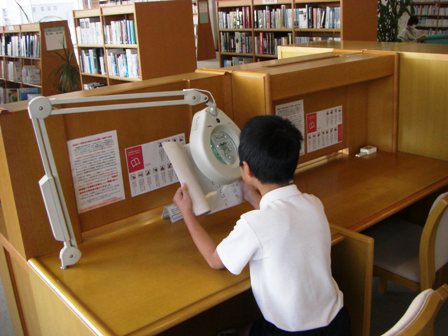 小さな文字の本を読んだり細かいところをよく見るために、大きな拡大鏡のついている席も用意してありました。