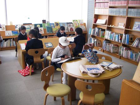 子どもの本のコーナーで選んだ本を読んでいます。いすや机も子ども用になっています。