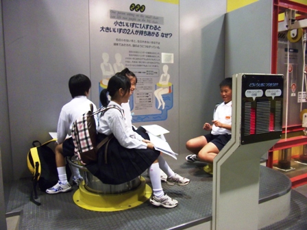 このいすを使うと、一人の体重で二人ぐらいの人が座ったいすを上げることができます。シリンダーの力を使っているそうです。