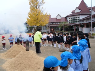 もみがらの山の中へ、準備したおイモを入れます。おいしくなぁーれ。