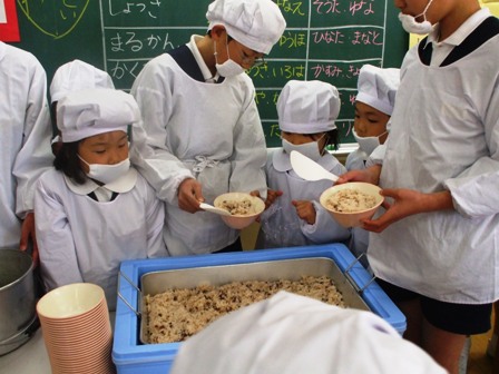 慣れるまでは、6年生と一緒に給食の準備をします。