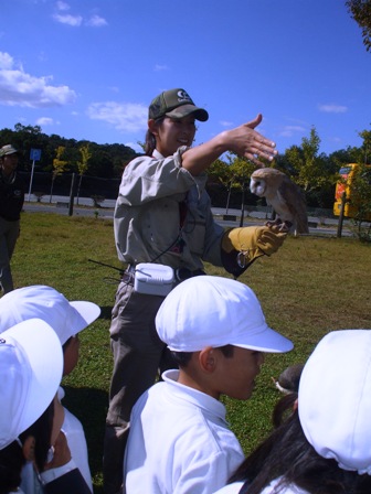 ミミズクの飛ばし方や止まり方を飼育員さんに説明してもらいました。爪が鋭いので皮の手袋をしていました。